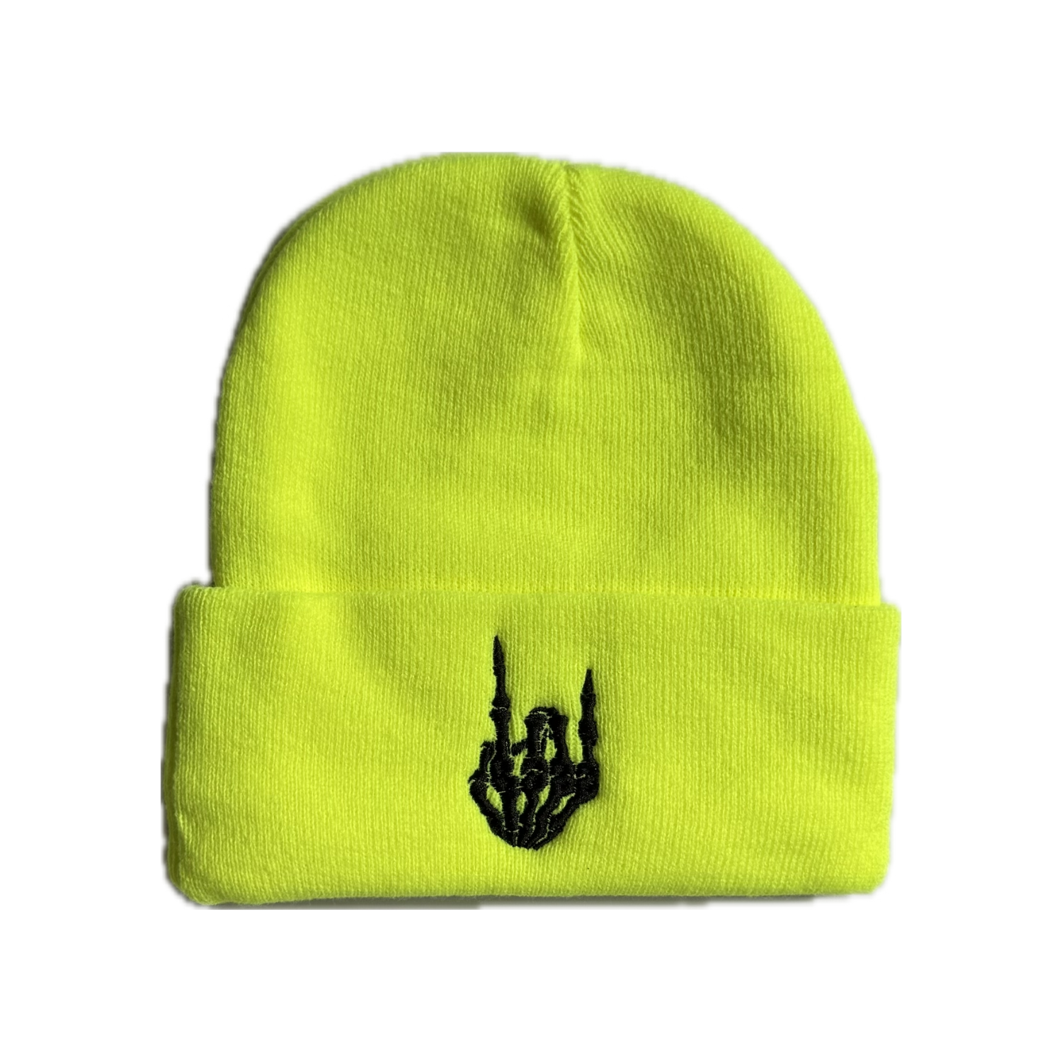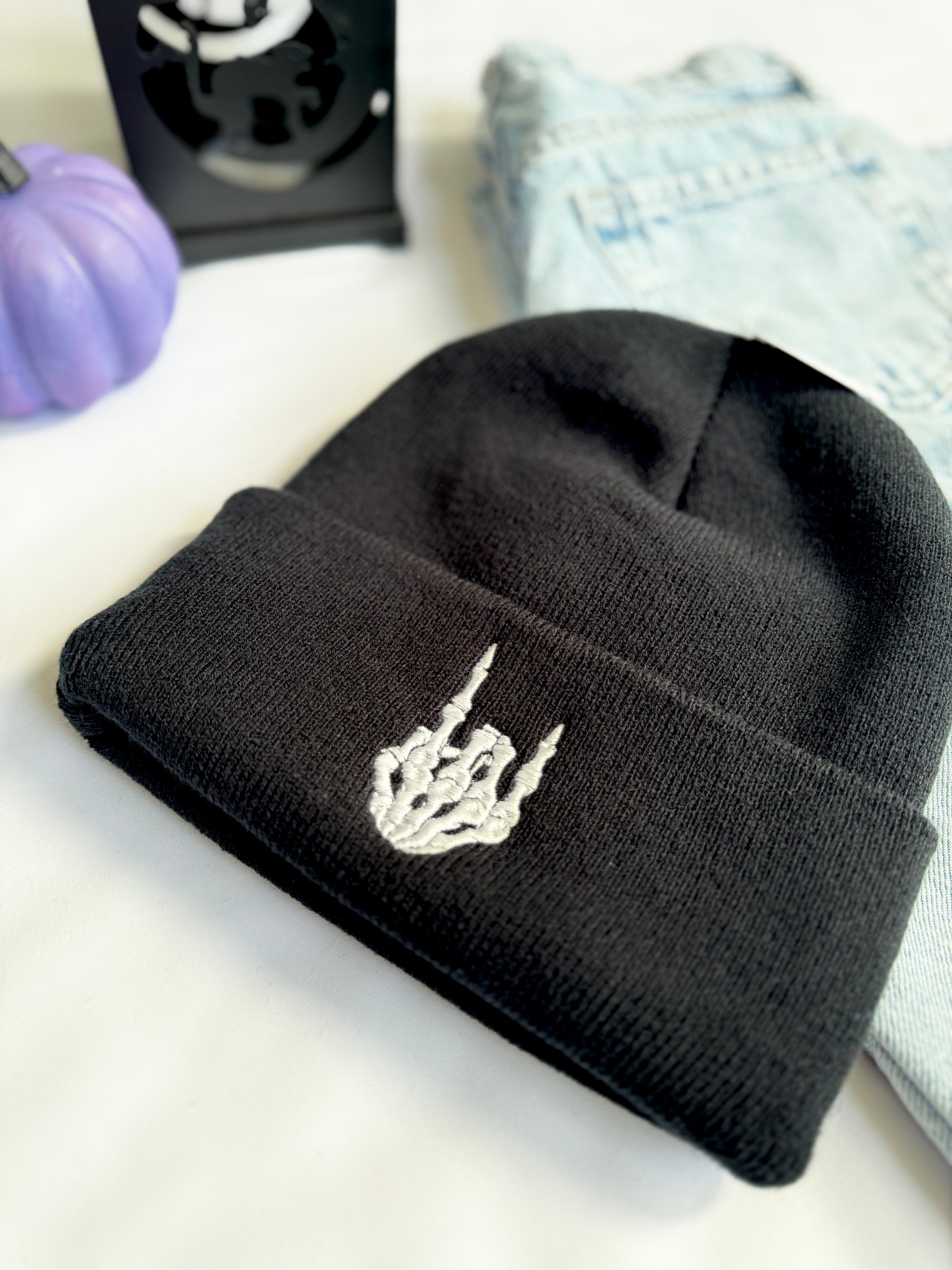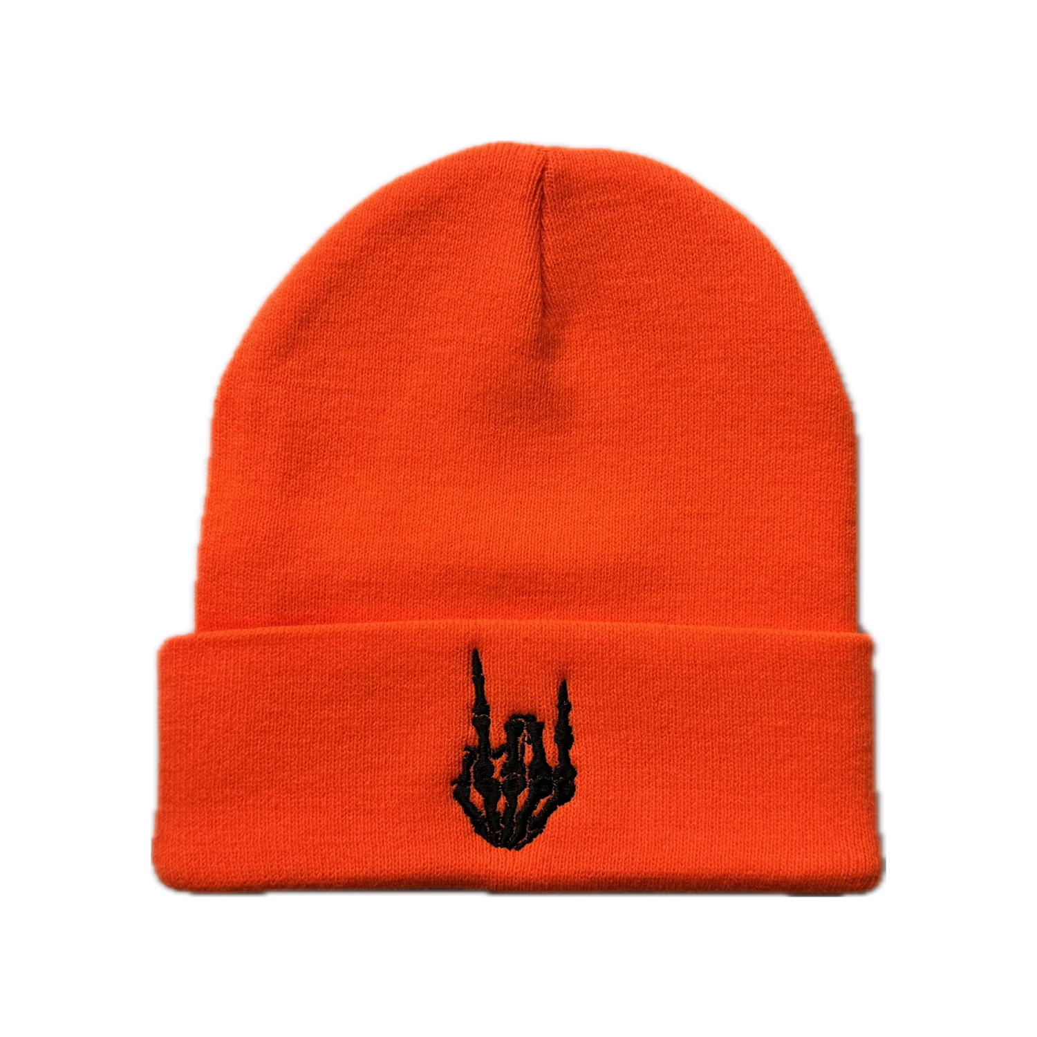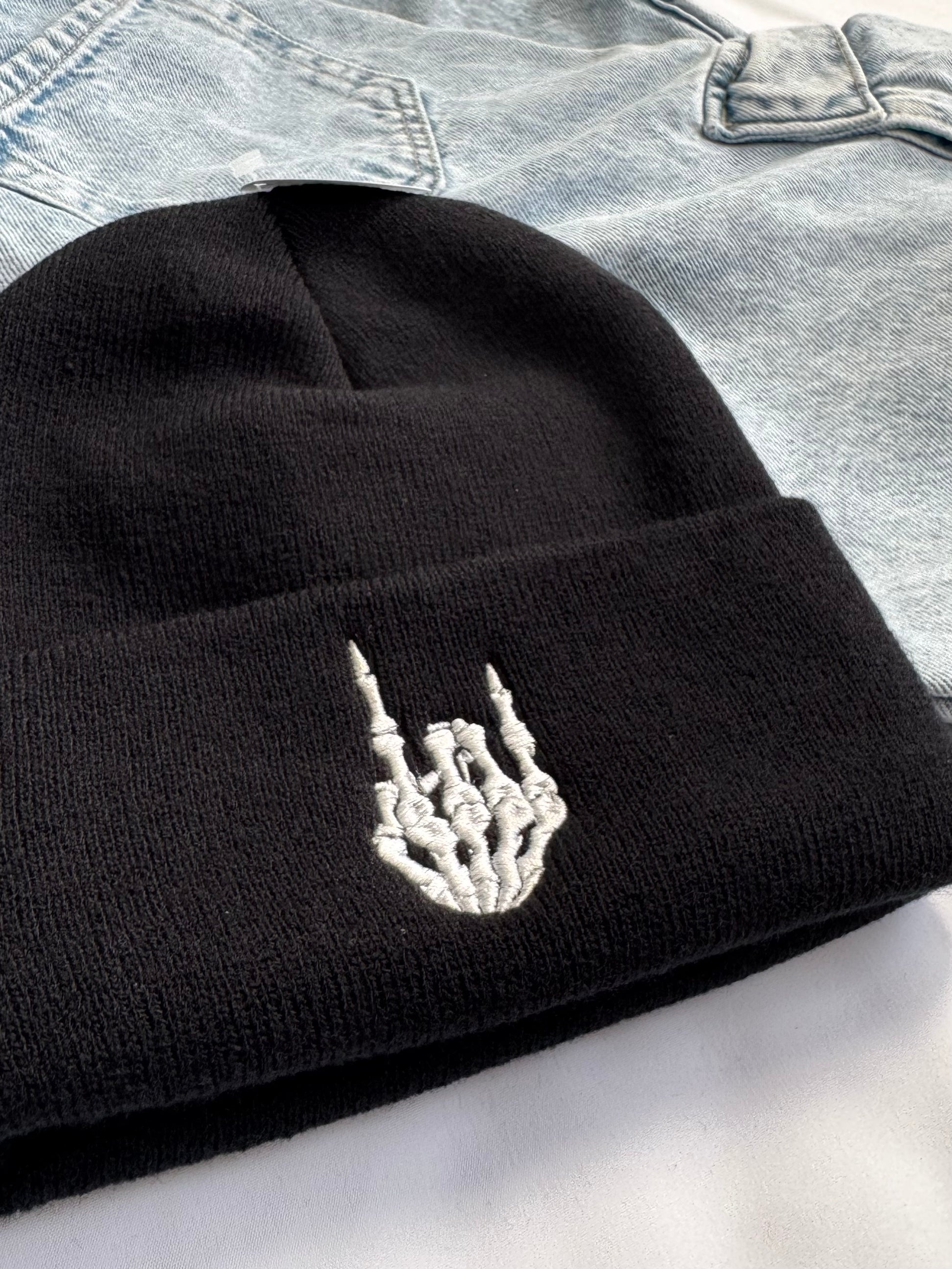 Turn up the spooky with this Halloween-ready beanie featuring a skeleton hand throwing the ultimate “rock on” sign. Cozy enough for crisp autumn nights, but bold enough to make a statement at every haunted hangout or pumpkin patch party. Pair it with your favorite hoodie or leather jacket and let your outfit scream Halloween vibes with a streetwise edge—because nothing says “trick or treat” like a little rebellious skeleton energy.